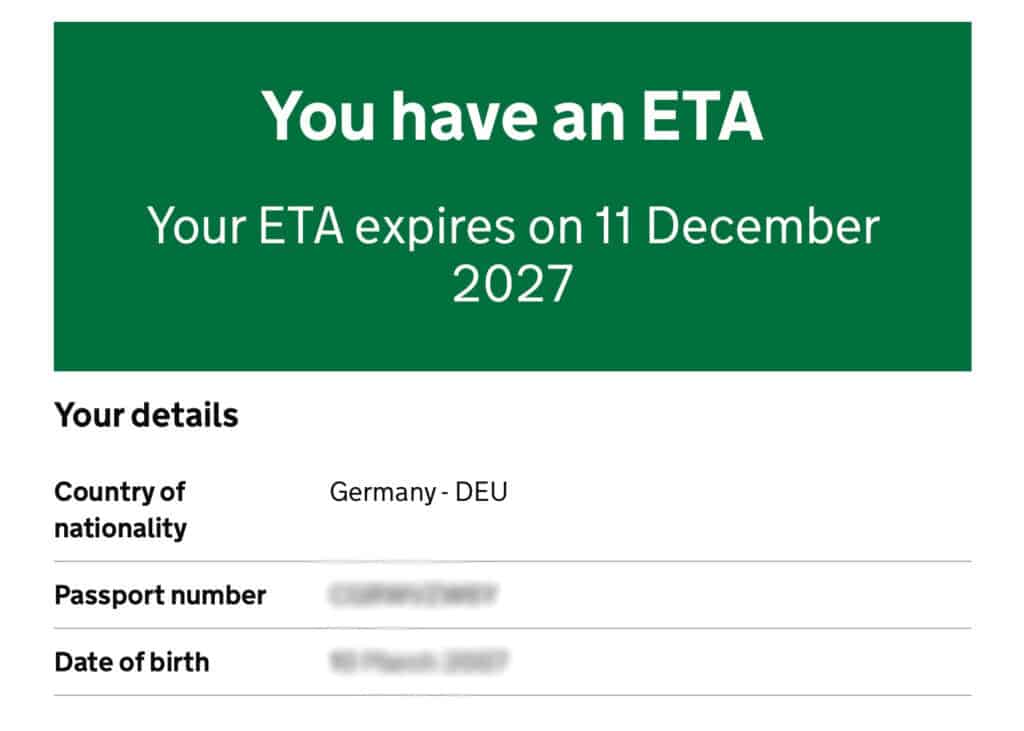 Sie können auf der Website der Regierung selbst den UK ETA Status abfragen. Sie benötigen dafür wiederum Ihren Reisepass. Nach korrekter Eingabe der abgefragten Daten erhalten Sie den aktuellen ETA Visa Status wie hier im Bild dargestellt.